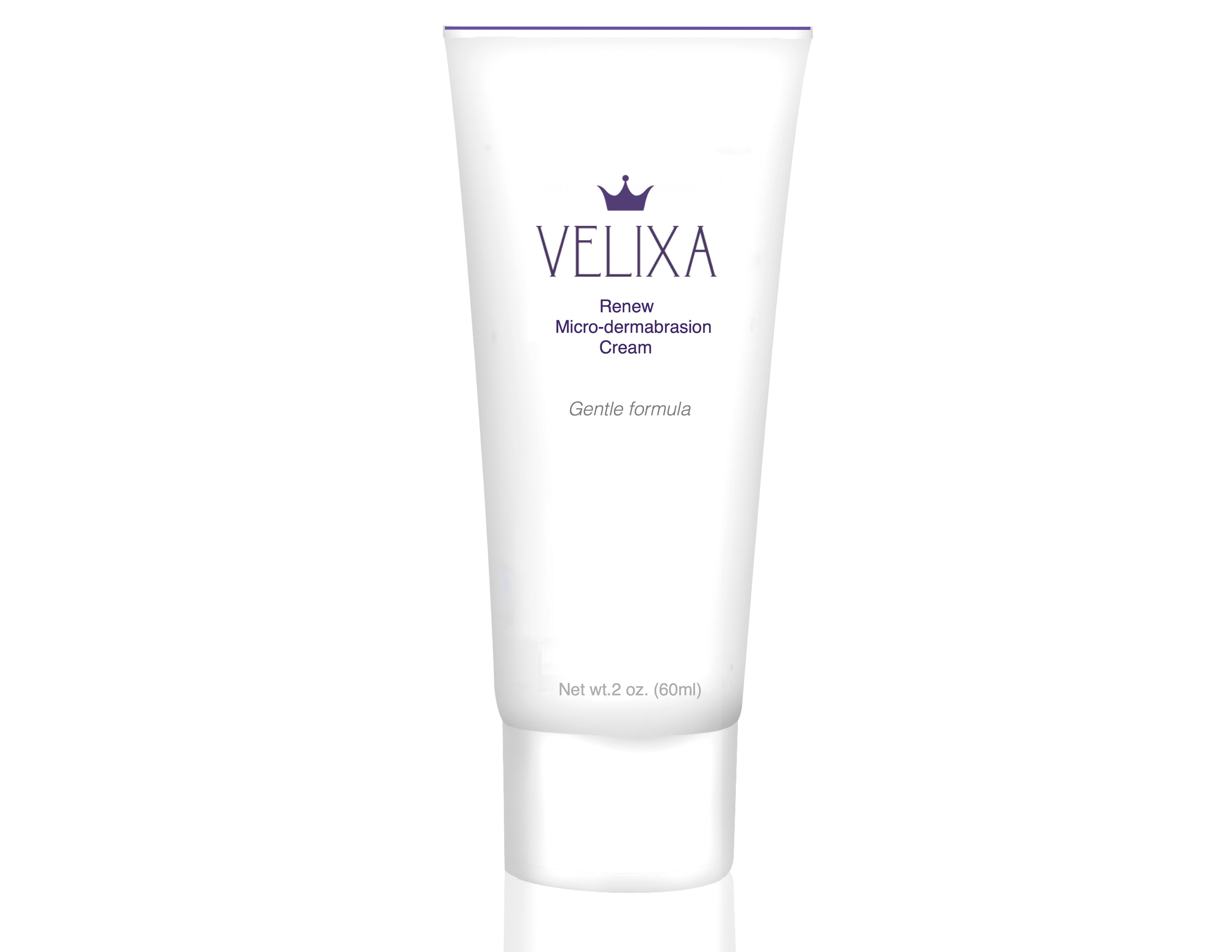 Next is a new-comer on the scene, the Micro Dermabrasion Renew Crème by Velixa. The crème is formulated with skin brightening agents that work overtime to help not only remove dead surface skin, but diminish hyperpigmentation spots caused by adult acne. This amazing scrub is moisturizing and gentle enough for daily use.